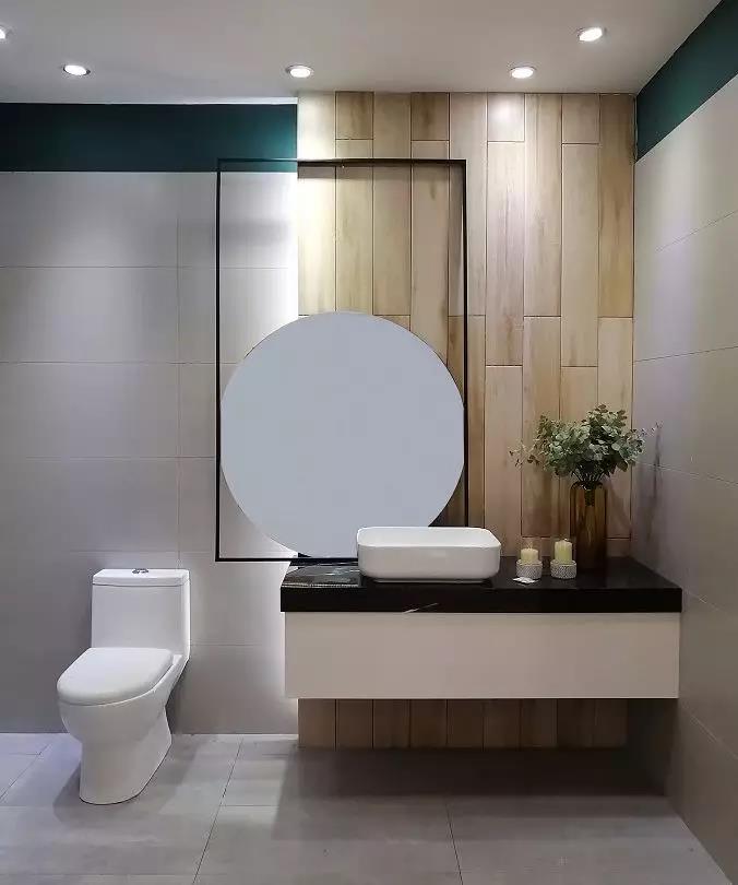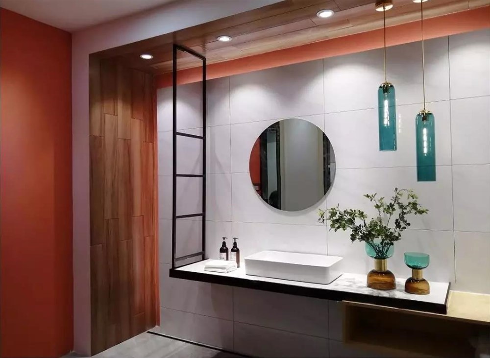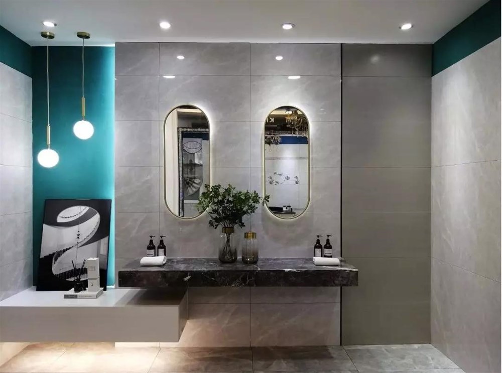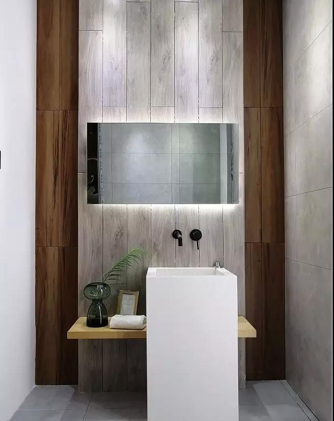 KPG48035是一款400*800規(guī)格的單面精雕干粒瓷片,洗手臺背景采用了150*900規(guī)格木紋磚KFG159C12,營造出了木質(zhì)的柔和,中和了灰色調(diào)的冷清,給衛(wèi)生間帶來了輕松的氛圍。48035是一款采用精雕干粒工藝的瓷片,通過精雕釉和干粒讓瓷片有凹凸的條狀布紋立體感,讓墻面更有空間感。