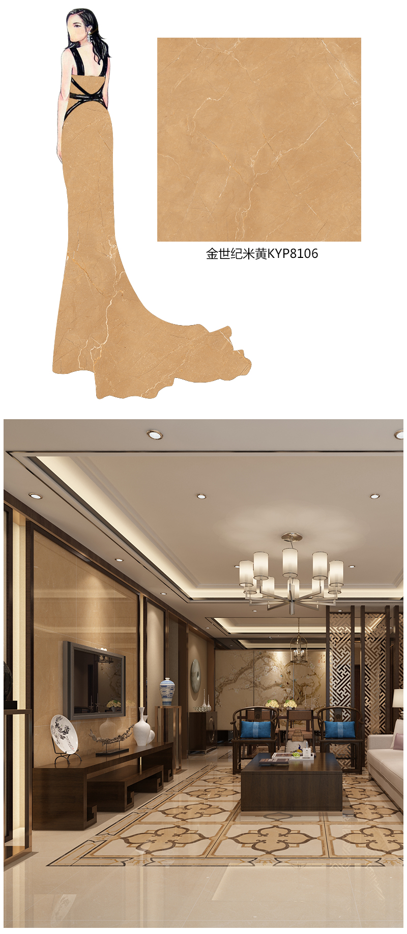 金艾陶金世紀米黃由黃色底紋與白色、金褐色線條組成逼真柔和且極高層次感的線條紋理。完美呈現金世紀米黃的流動質感,如月光下的冰山般輕盈通透又獨具詩般的厚重。