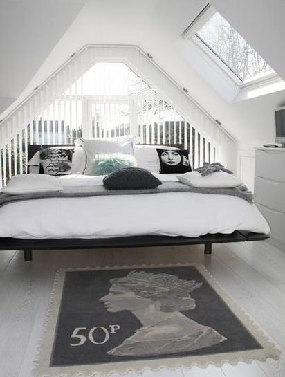 想必應該沒有人禁止你把家具放在窗戶旁邊吧。這張床的擺放充分利用的小閣樓的結構造型。垂直的百葉窗在阻擋過多的陽光的同時保護了主人的隱私。