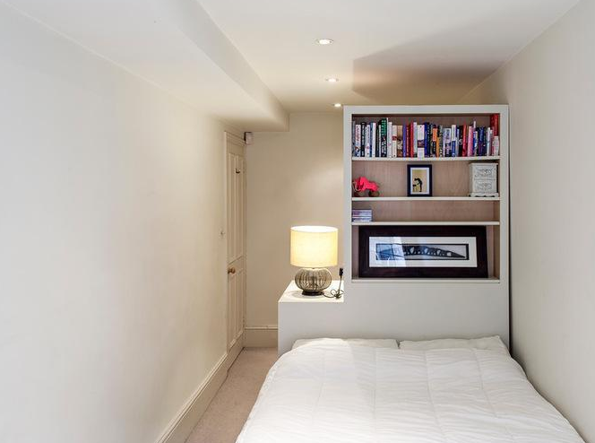 如圖的臥室設計巧妙地結合了空間來展示珍品,貨架上可以擺放書籍,抽屜在用來存放更多的個人物品的同時還充當了床頭柜。