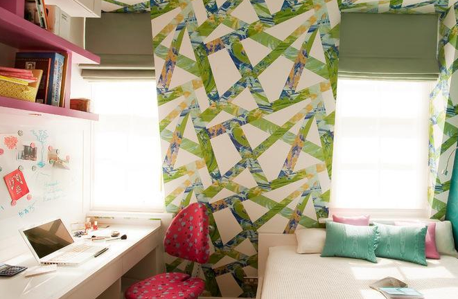 在一個擁擠的空間里,在墻上涂鴉或是貼上壁畫,盡顯主人的風格個性。圖中漂亮的墻紙設計連接著淡藍色的墻壁,提升了整個臥室空間的凝聚力,讓臥室更有個性。