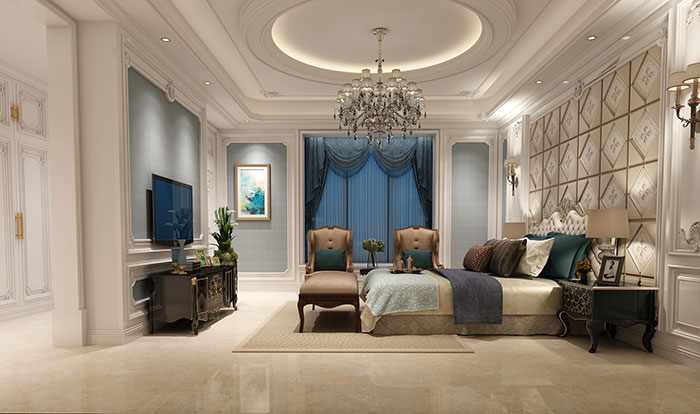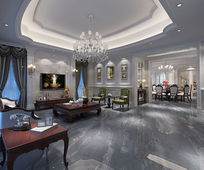 這是一個很大的客廳,因此設計師設計了一個造型別致的吊頂,鑲金邊的異型吊頂圖案,使平面的天花板呈現出立體感,恢弘大氣。
