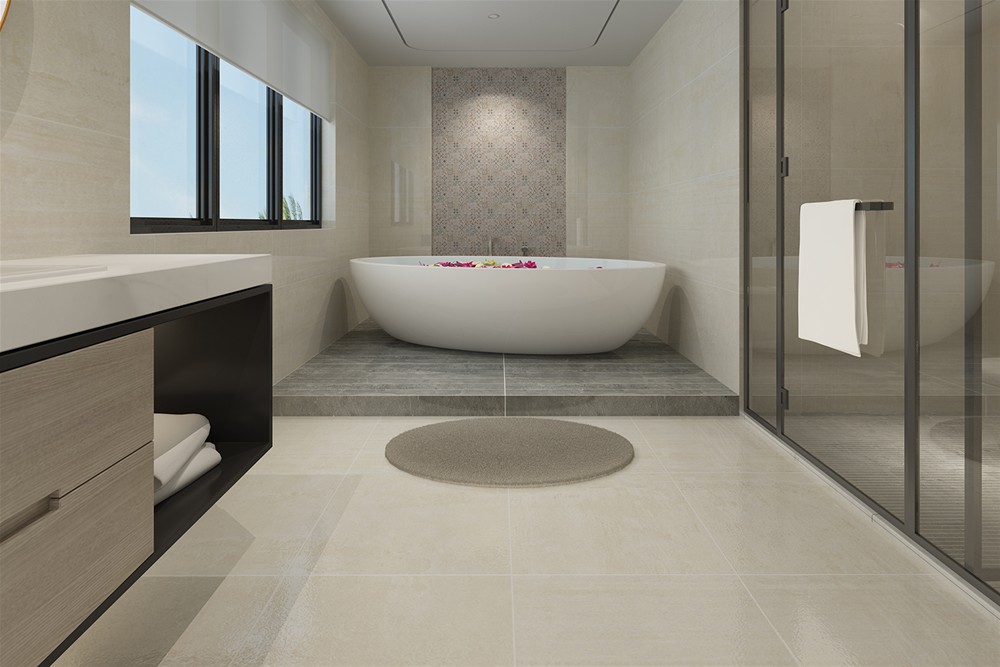 浴缸后的背景運用阿瑪羅尼現代仿古磚的花磚進行鋪貼,自然灑脫、隨意流暢,將產品的魅力表現得淋漓盡致!