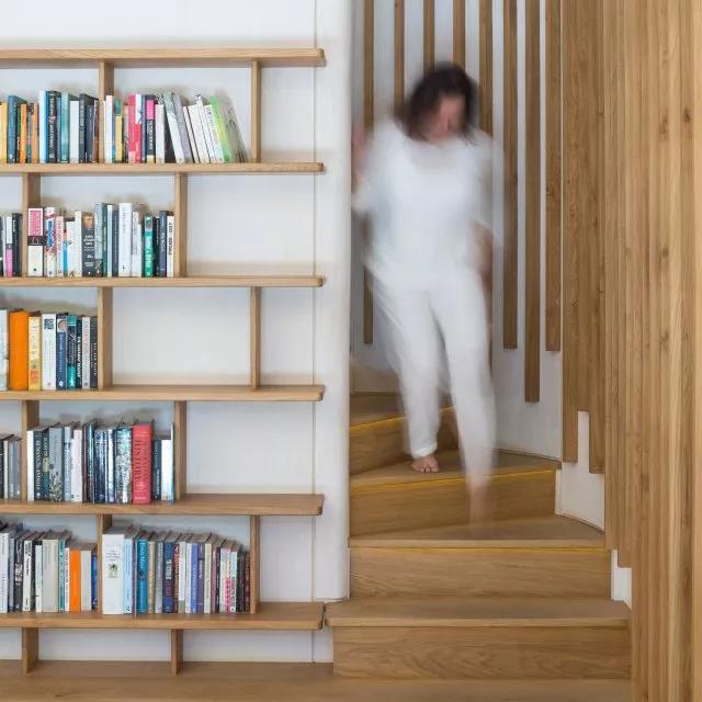 大面積的書架不一定是一成不變的,可以根據(jù)家里的特點(diǎn)而變化。高低起伏的書架邊緣為家里的小動物創(chuàng)造出一個(gè)攀爬的空間,也是別于其他書架的特色之一。
